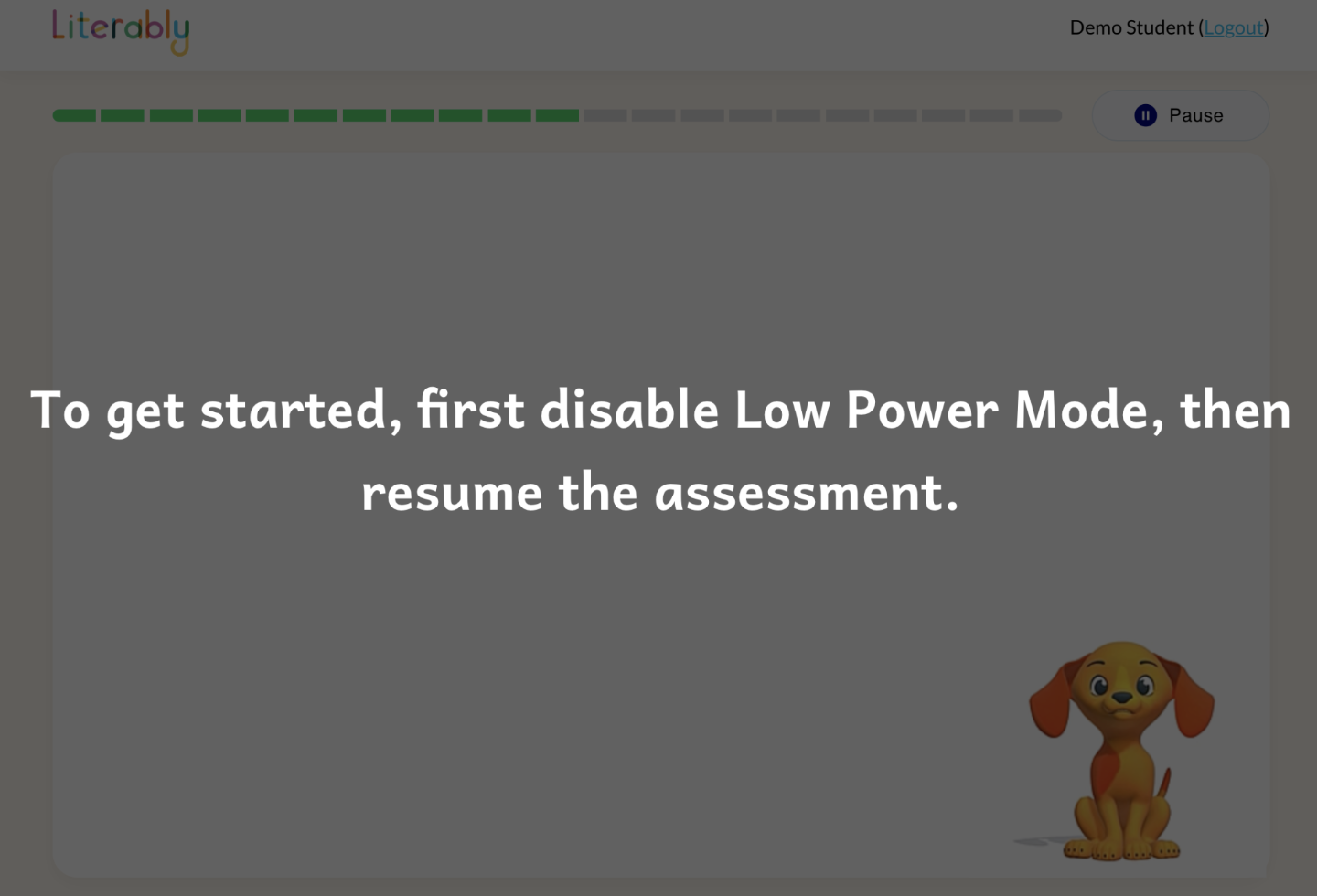 4. Version 1.3.0 supports Literably's new foundational skills assessments. The iPad should not be in Low Power Mode for foundational skills assessments to display properly.