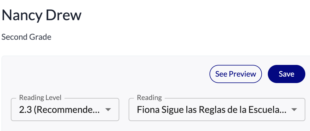 To select a different level/text than what is recommended for Fluency, use the drop-down menus for "Reading Level" and "Reading." Use "See Preview" to preview or print the text, and make sure to click "Save" to save your changes.